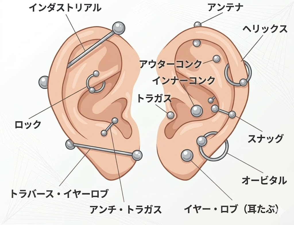 - オービタル : 耳たぶのやや上の部分を輪状に2か所開けた位置